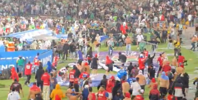 Imágenes compartidas en redes sociales muestran a decenas de aficionados corriendo por la cancha del estadio Atanasio Girardot y lanzándose objetos entre sí.