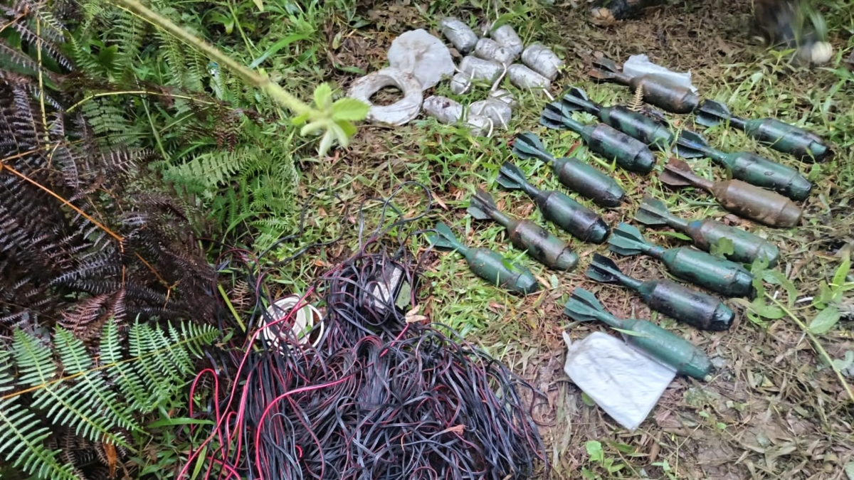 En el sector fueron encontrados 14 granadas artesanales, 25 libras de pólvora negra, 100 metros de mecha retardadora, 300 metros de cable dúplex, un chaleco multifunción y balas.