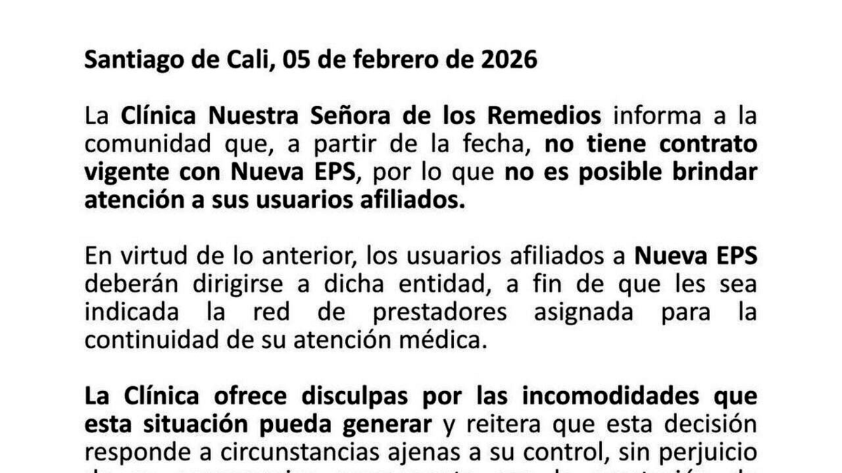 El comunicado de la institución dice: “La Clínica Nuestra Señora de los Remedios informa a la comunidad que al día de hoy no tiene contrato vigente con Nueva EPS por lo que no puede brindar atención a sus usuarios afiliados”.