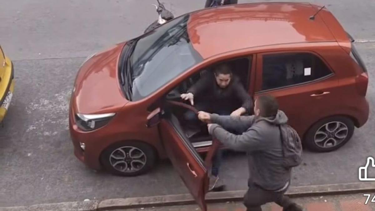 Luego, el conductor del automóvil intenta abrir la puerta para irse y defenderse de una fuerte agresión, pero el dueño de la motocicleta la evita y arroja la puerta de una manera muy violenta.